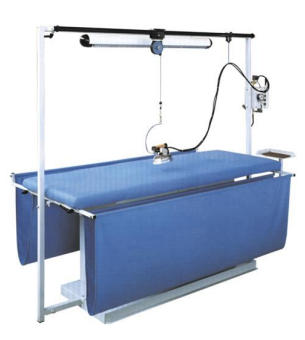 Stół prasowalniczy MP/F/T 250×75 prostokątny do prasowania materiałów o dużej powierzchni (m.in. zasłon) o rozmiarach 250 x 75 cm z odsysaniem i podgrzewaniem elektrycznym. Regulacja temperatury stołu za pomocą termostatu, wbudowany odsysacz. Zestaw składa się z kotła inox o pojemności do 7 litrów, automatycznej pompy wirowej zasilającej w wodę, manometru kontrolującego ciśnienie, elektrozaworu z regulacją pary, podkładki silikonowej pod żelazko oraz podstawy do zawieszenia żelazka bez lampy i zawiesia.