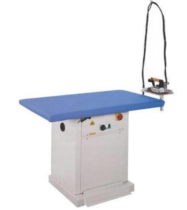 Stół prasowalniczy prostokątny z odsysaniem i podgrzewaniem elektrycznym. Regulacja temperatury stołu za pomocą termostatu, z możliwością podłączenia odsysania centralnego. Stół jest przystosowany do podłączenia instalacji centralnej pary. Zestaw składa się z podkładki silikonowej pod żelazko oraz z drążka podtrzymującego przewody.