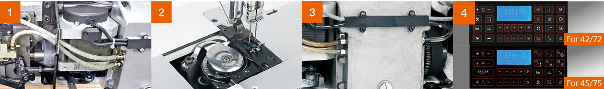 Panel sterowania to wielofunkcyjna, intuicyjna konsola z bezpośrednimi klawiszami, a całość kontrolna jest zamontowana z tyłu maszyny, co ułatwia instalację i oszczędza miejsce w warsztacie. Przejrzysty układ pozwala na szybkie i wygodne ustawianie parametrów szycia.